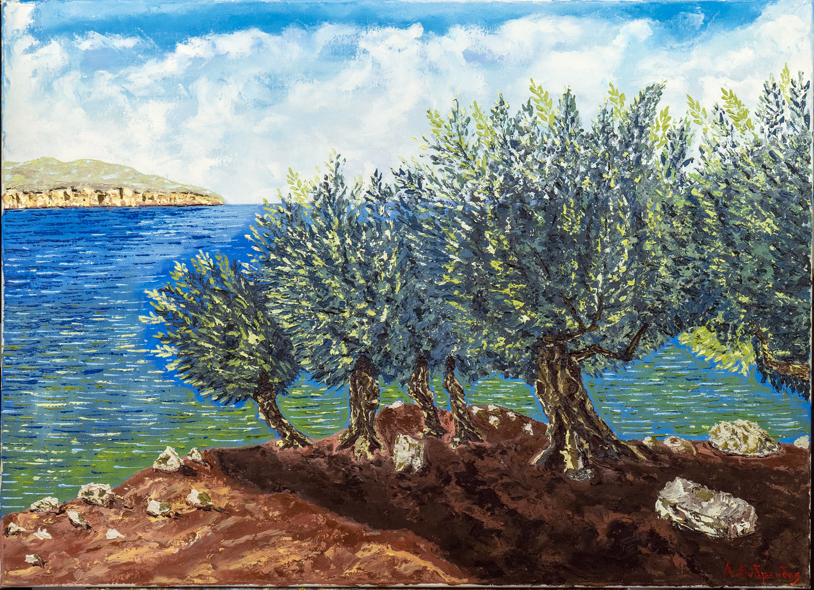 Experience the ultimate convergence of the Greek land and the sea. This imposing composition depicts an olive grove cascading down to the shore, offering a sense of coolness, shade, and eternal serenity. A work that radiates the authentic aura of Mediterranean nature.