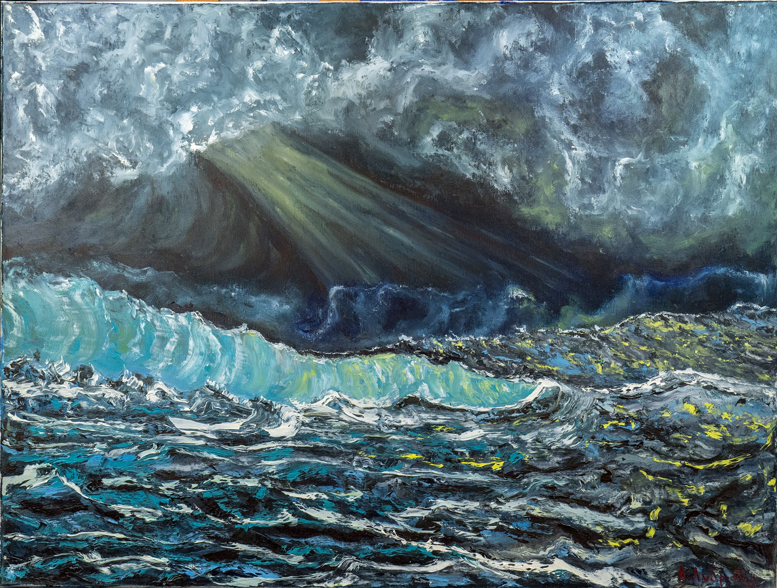 • Explosive Palette Knife Technique (Impasto): The palette knife is used here to provide volume and motion. The waves seem to leap off the canvas, creating a textured landscape you can almost hear. The thick layers of oil grant a sense of vitality that shifts and changes under the light.