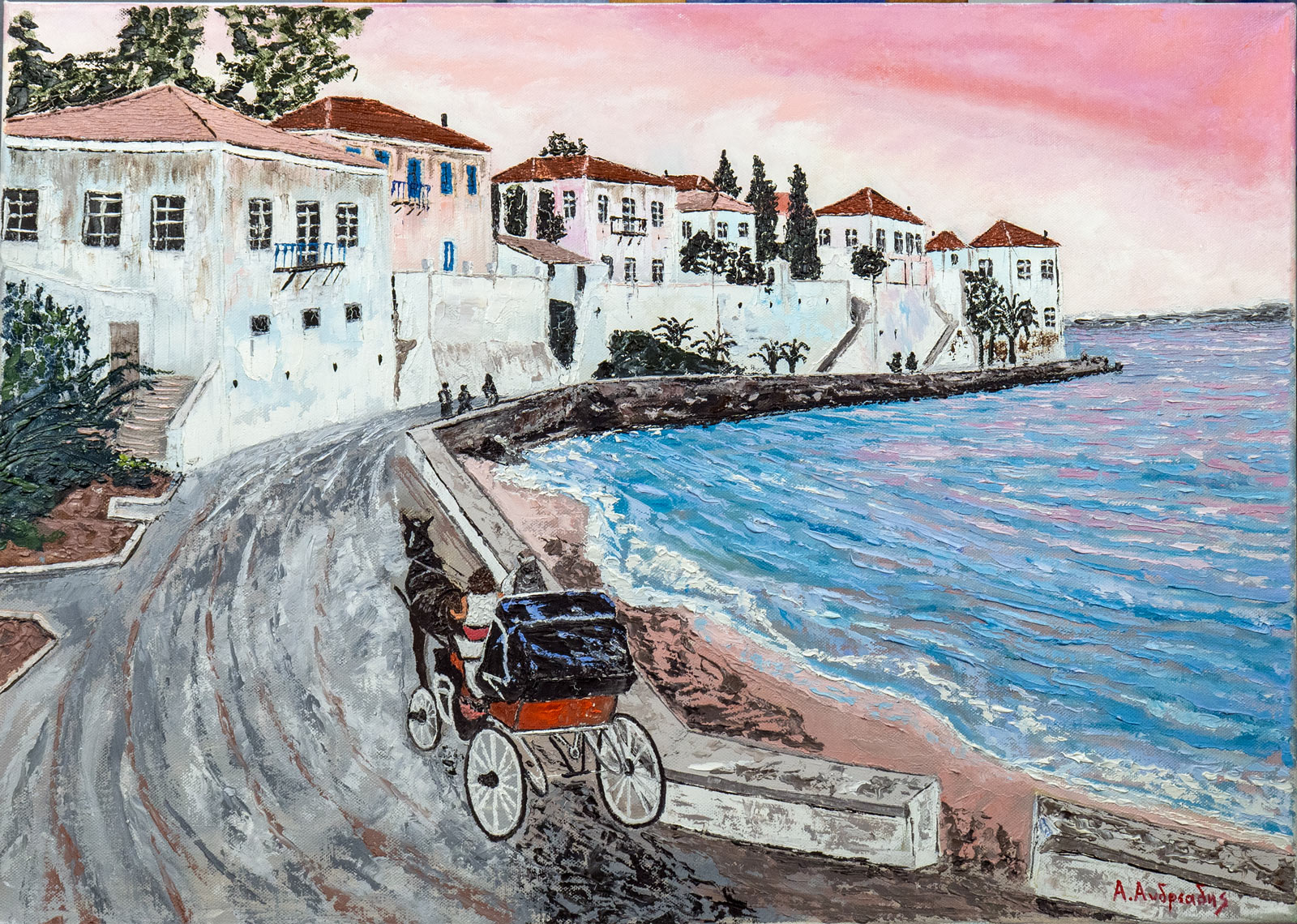 - The Radiance of the Saronic: The color palette focuses on the pure light that bathes the waterfront, highlighting the ochre tones of the architecture against the deep blue of the Spetses sea.