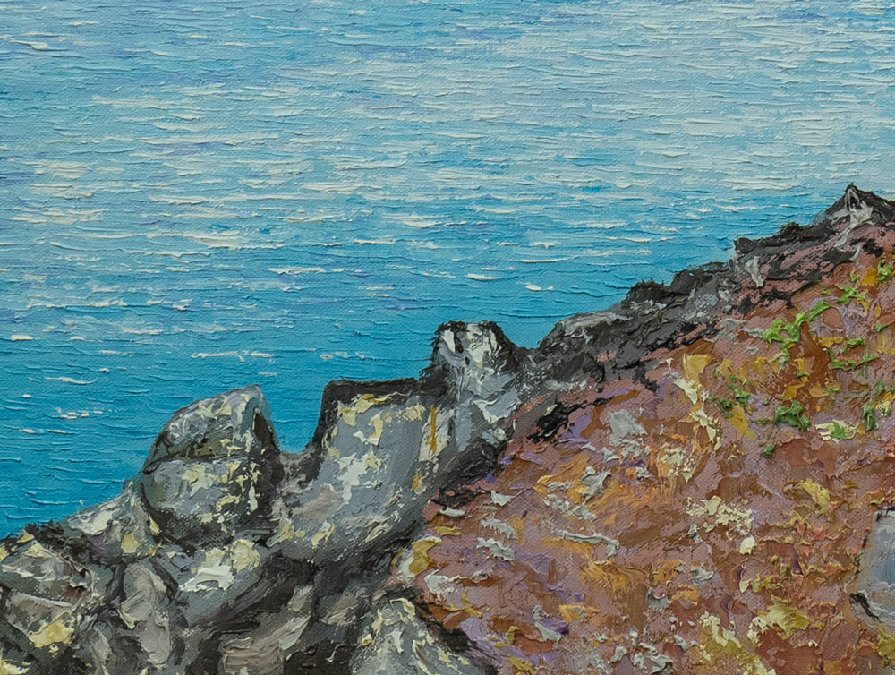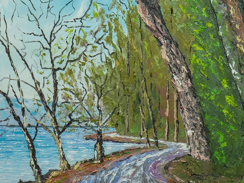 Artist: A. Andreadis Medium: Oil on Canvas (Impasto Technique)  A vibrant landscape study focusing on texture and light. This piece features a coastal road set against a deep blue lake and misty distant peaks, characterized by its tactile surface and serene composition.