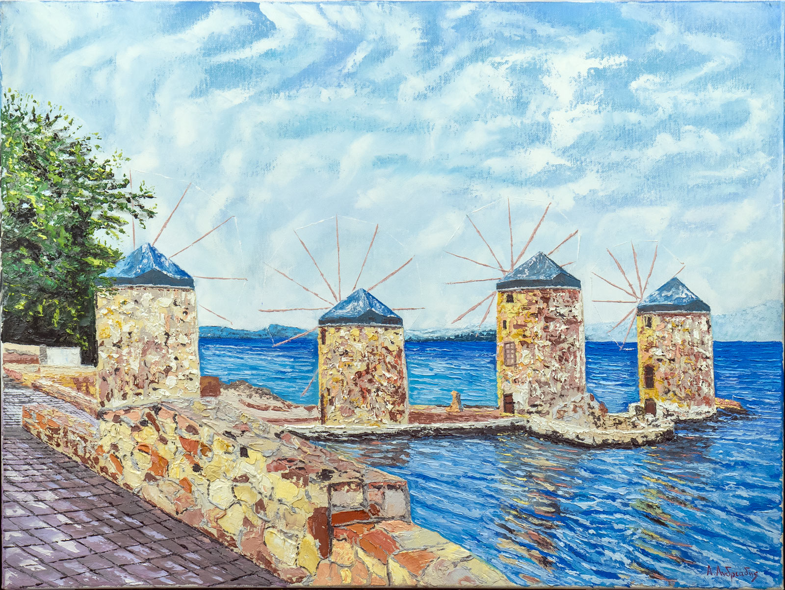 Journey to the Dodecanese through a composition that seamlessly blends tradition with modern expressionism. The historic windmills of Kos, standing proudly against the open sea, become the protagonists of a work that radiates light, breeze, and the timeless charm of the Aegean.