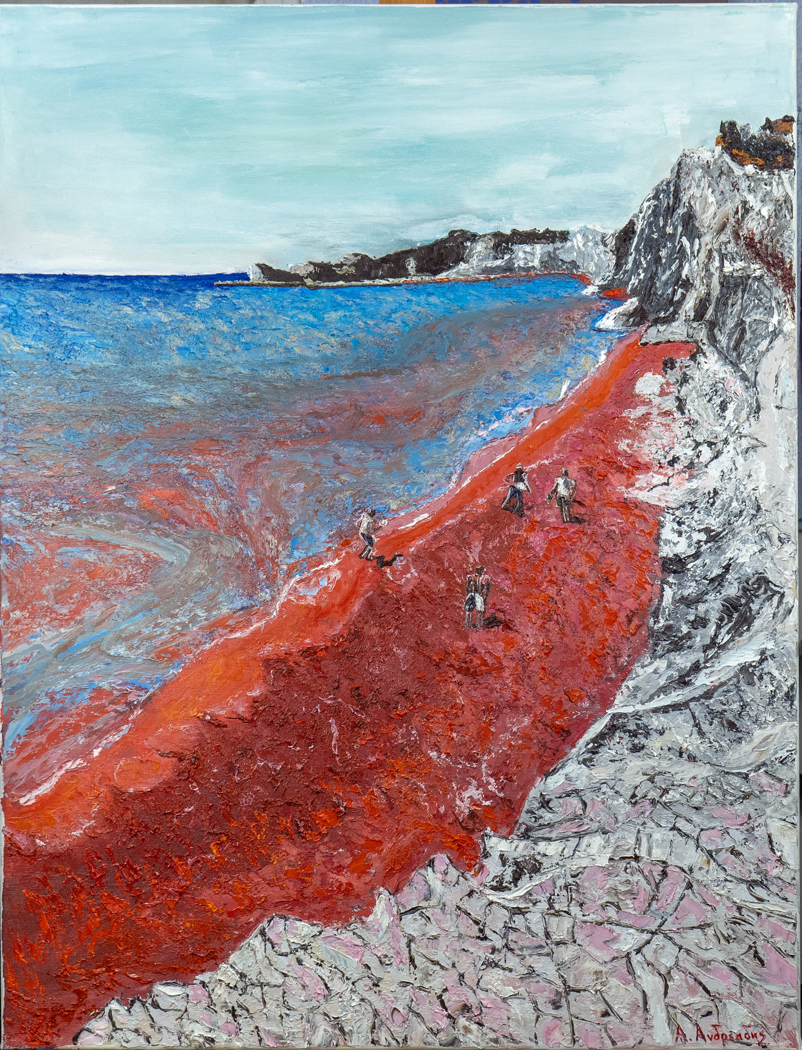Journey to the Ionian Sea through a composition that celebrates the uniqueness of Kefalonia. “Xi Beach” is captured here in all its glory: the characteristic reddish-orange sand, the white clay cliffs, and the crystalline waters unite in a work pulsating with color and energy.